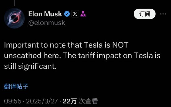 3月27日,特斯拉CEO埃隆·马斯克在社交平台X上回复了一条有关汽车关税对美国汽车制造商可能产生的影响的贴文,并表示:“值得注意的是,特斯拉并非毫发无损。关税对特斯拉的影响仍然很大。”