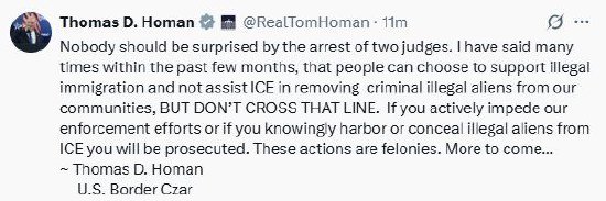 特朗普任命的“边境沙皇”汤姆·霍曼(Tom Homan)在X平台表示:“两名法官被捕,这不应让任何人感到惊讶。在过去几个月里我多次说过,人们可以选择支持非法移民,也可以选择不协助移民与海关执法局(ICE)将非法移民罪犯从我们的社区驱逐出去,但不要越界。”