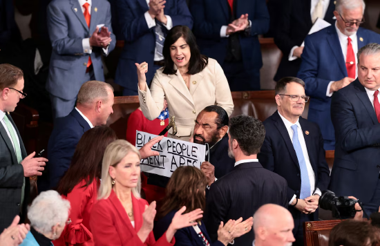 美国得克萨斯州民主党议员阿尔·格林被护送离开活动现场。自特朗普步入会议厅那一刻起,格林就始终高举写有“黑人不是猿猴”的标牌——这直指特朗普曾发布种族主义视频,将美国首位黑人总统巴拉克·奥巴马描绘成猿猴的行为。格林去年也因扰乱特朗普演讲而被强制带离会场。