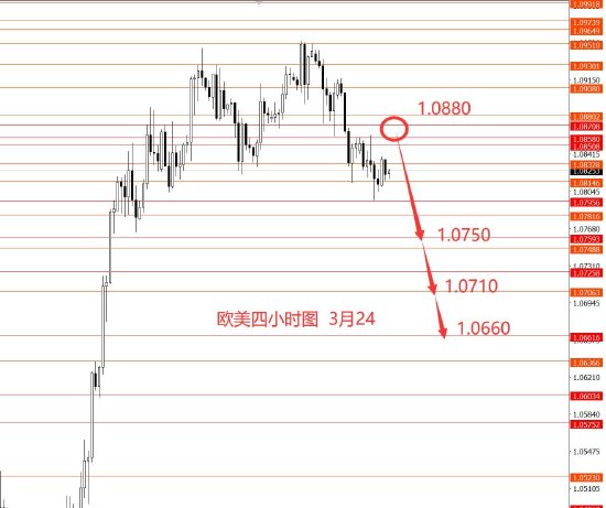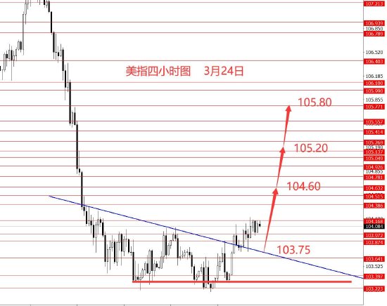 3月24日,美指上周103.20得以支撑反转行情出现。从图形来看,本周美指看反弹,下方重点关注103.40,以上继续向上反弹概率较大些。操作建议:103.80附近做多,止损103.20,目标看向104.60和105.20和105.80附近。控制仓量,严格止损。