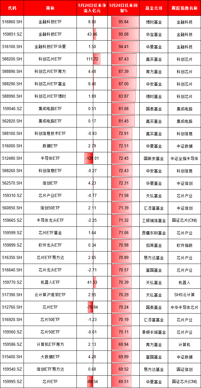 在单只ETF涨跌幅排名中,博时基金、华宝基金、华夏基金旗下的金融科技ETF涨幅约95%,位居前三。嘉实、南方、华安、博时旗下的科创芯片ETF涨幅约87%,位居第四至七名。