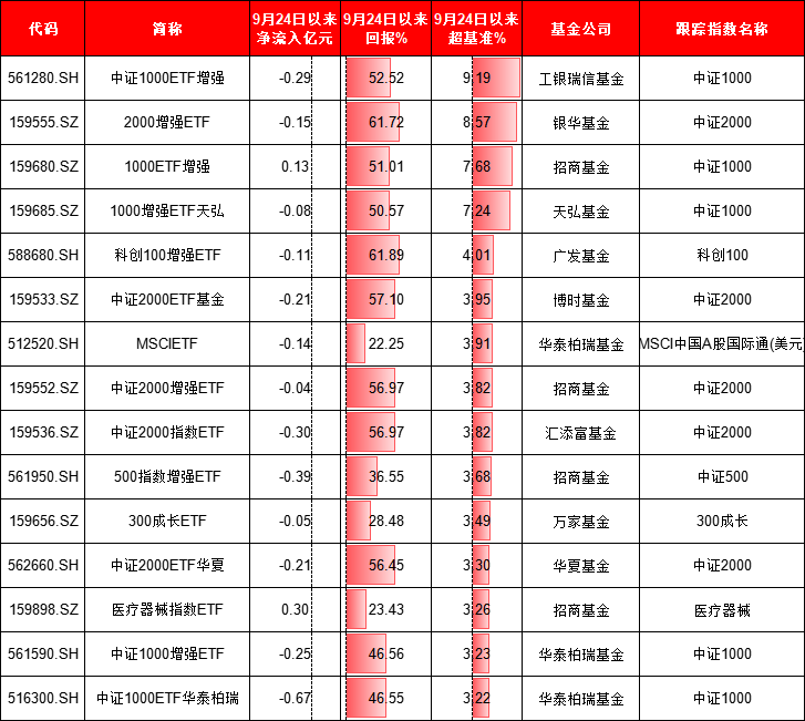 自9月24日以来,从跑赢业绩基准的情况看,工银瑞信中证1000ETF增强跑赢基准9.19%,银华2000增强ETF跑赢基准8.57%,招商基金1000ETF增长跑赢基准7.68%。