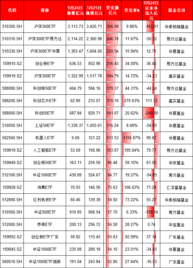 从规模变化来看,华泰柏瑞基金沪深300ETF规模增加307亿元,位居首位。沪深300ETF易方达规模增加247亿元,沪深300ETF华夏规模增加221亿元。
