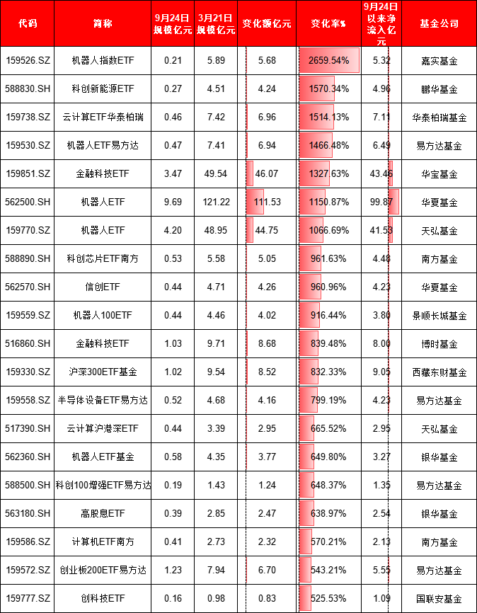 规模变化率:嘉实机器人指数ETF增26.6倍,博时可持续发展ETF缩水82%