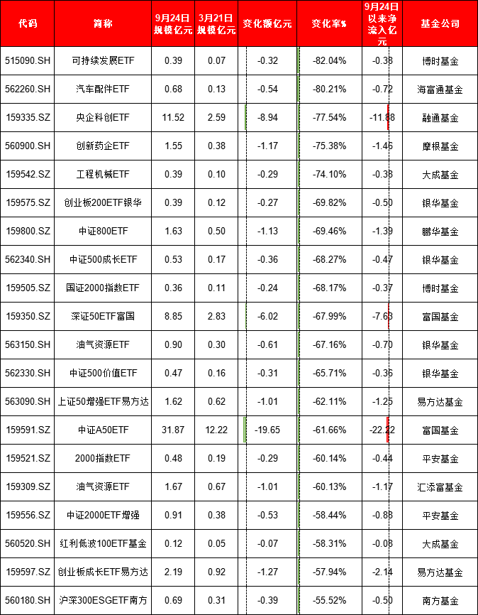 博时可持续发展ETF规模从0.39亿元降至0.07亿元,降幅82%。海富通汽车配件ETF规模从0.68亿元降至0.13亿元,降幅80%。融通基金央企科创ETF规模从11.5亿元降至2.59亿元,降幅77%。
