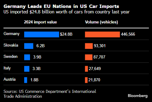 关税可能会颠覆欧洲汽车产业对利润丰厚的美国市场的出口依赖。德国汽车制造商面临的风险最大,因为它们向美国出口的汽车数量超过向任何其他国家的出口量,其中包括许多利润率更高的内燃机车型,如保时捷911跑车和梅赛德斯-奔驰S级豪华轿车。