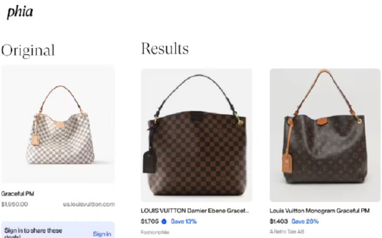 Phia方面称,该应用借助AI分析当前市场趋势,并与来自The Real Real、Vestiaire Collective、ThredUp、StockX、eBay和Poshmark等平台的超2.5亿件二手商品数据进行对比。