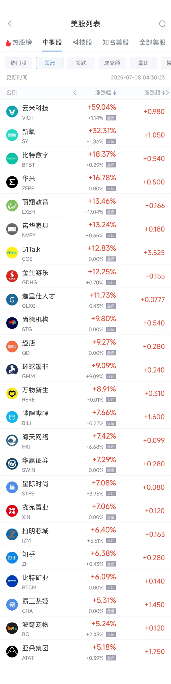领涨中概股列表: