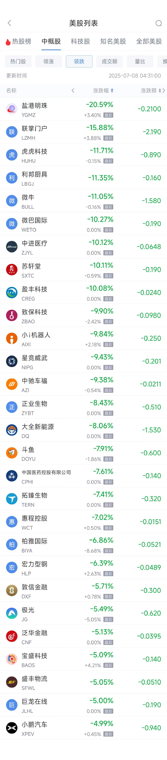 领跌中概股列表: