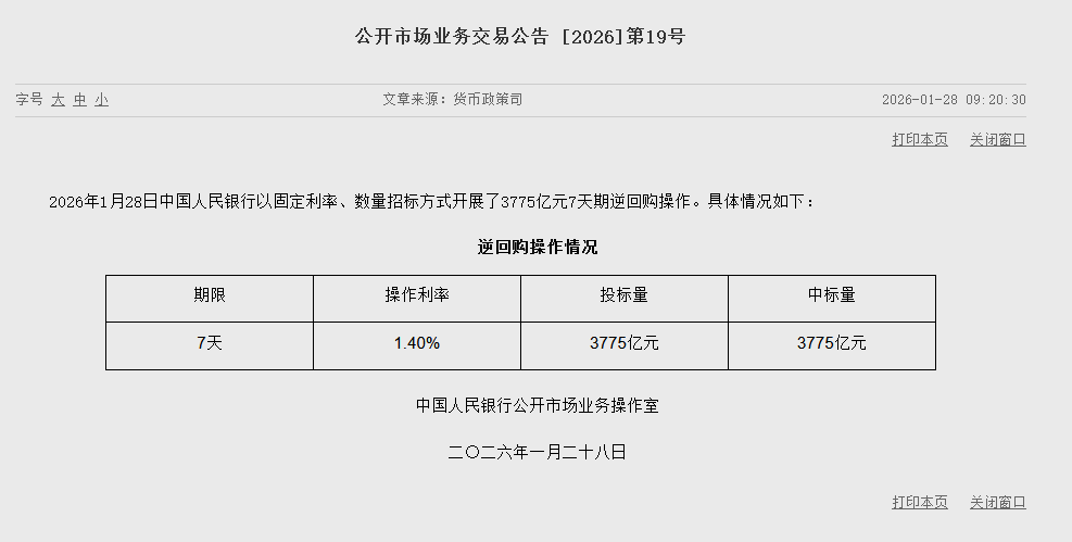 - 2026-01-28央行开展3775亿元7天期逆回购操作